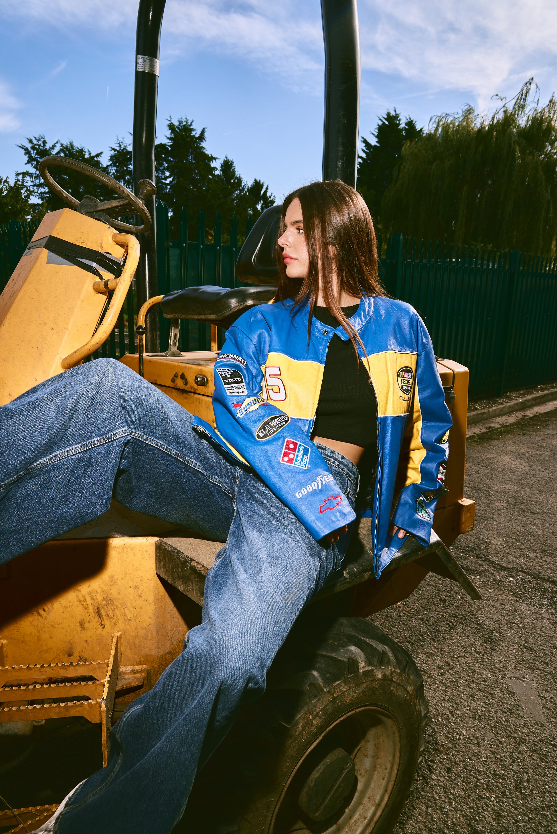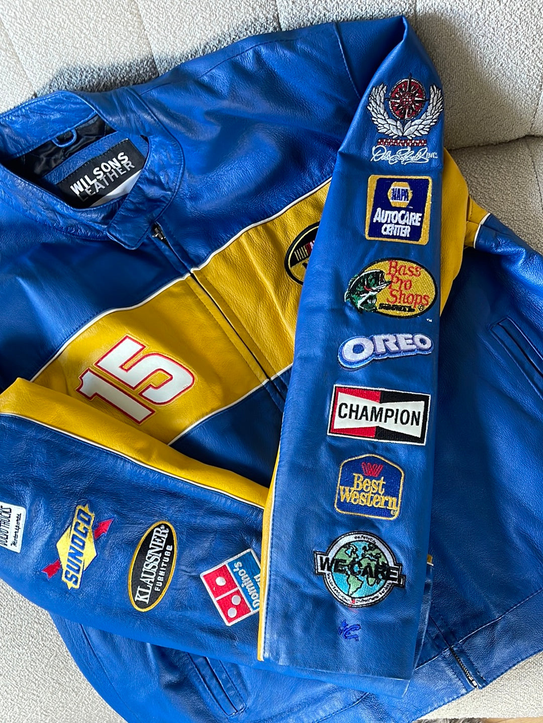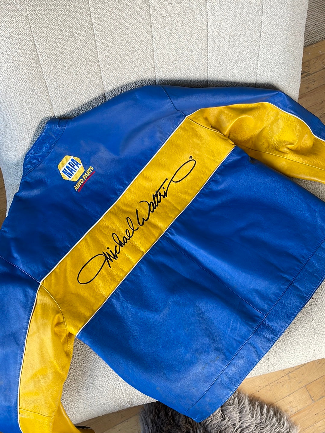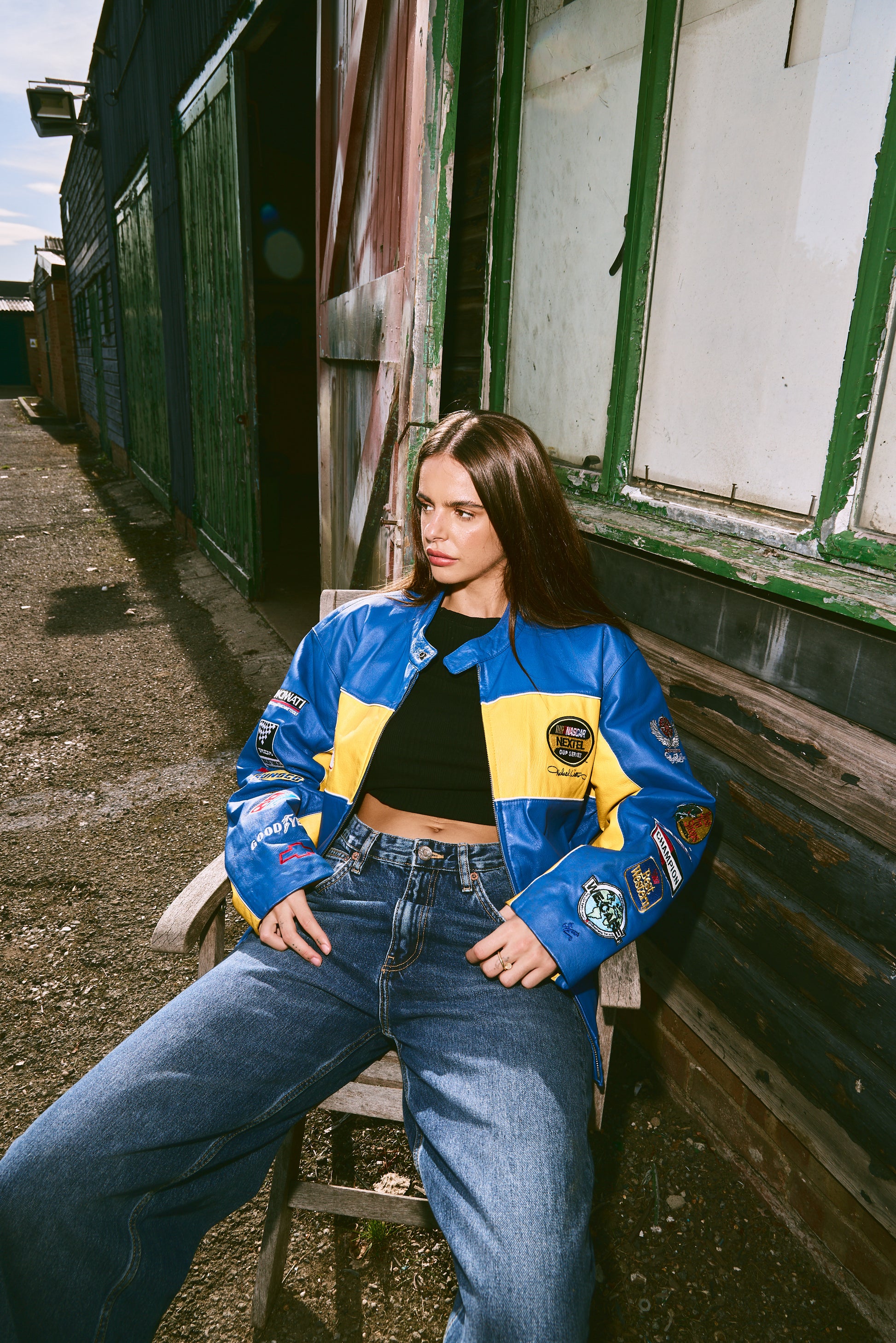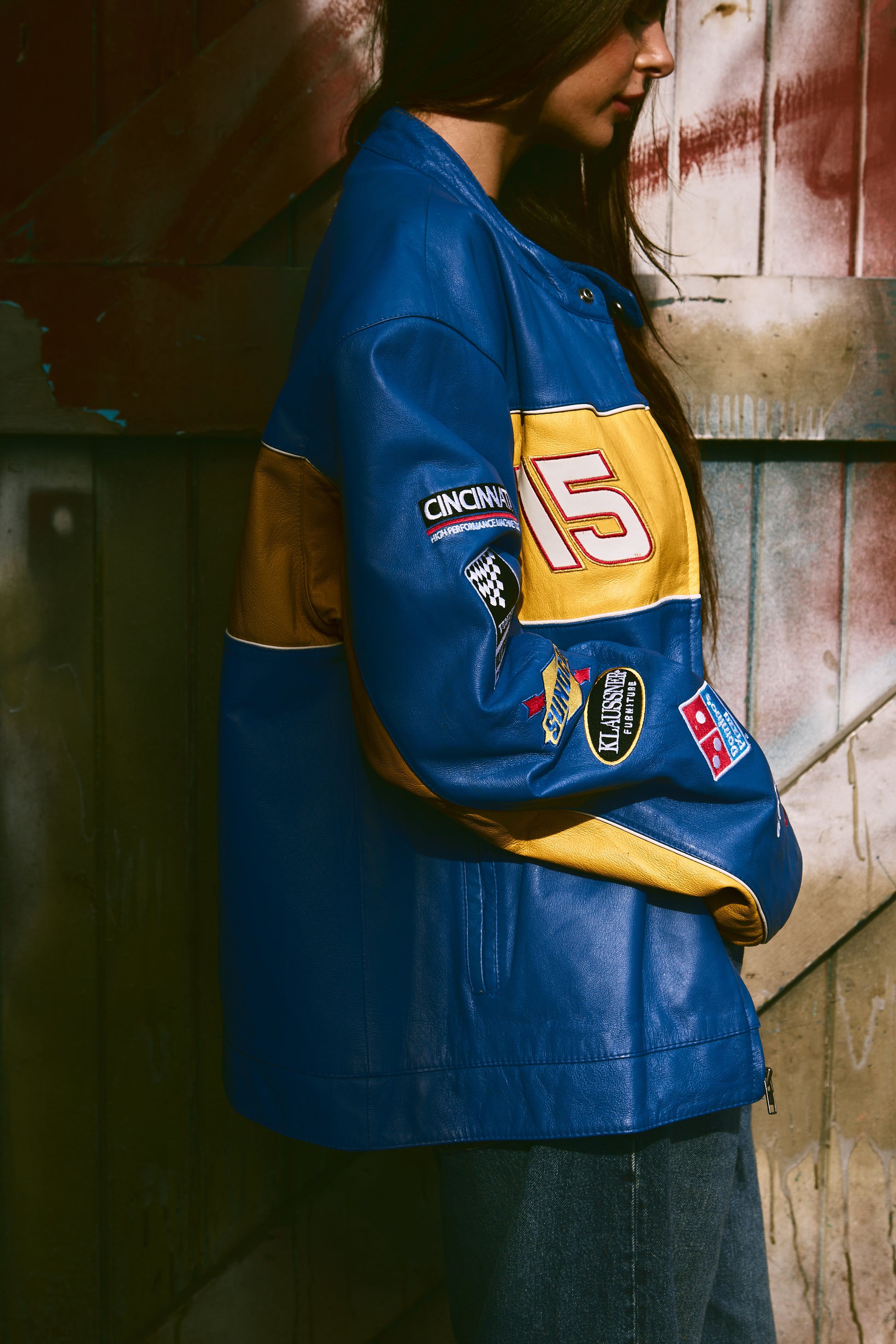 Blue & Yellow Leather Badge Lightweight Biker Jacket Unisex