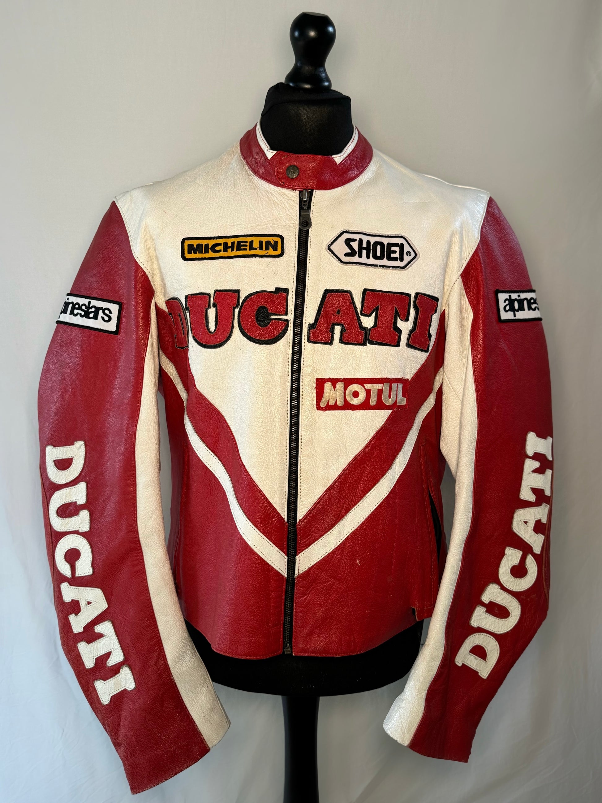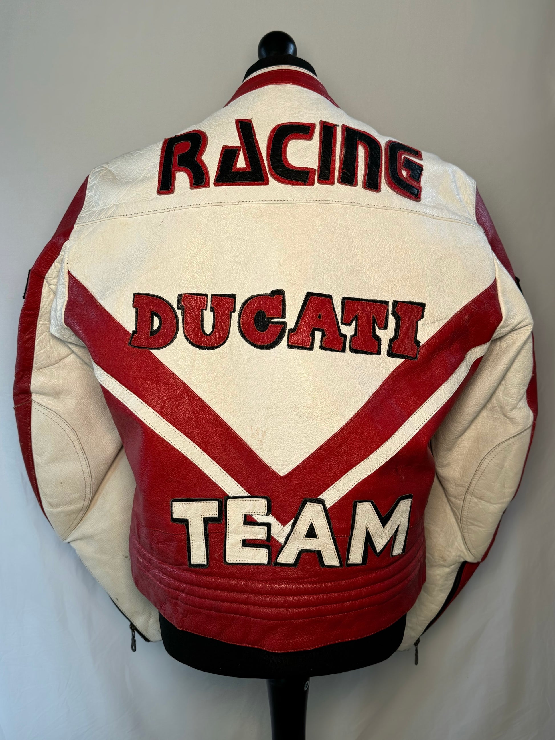 This Ducati racing jacket is crafted from red and white leather, in a very good condition. As it's a vintage piece the jacket has only light signs of wear.