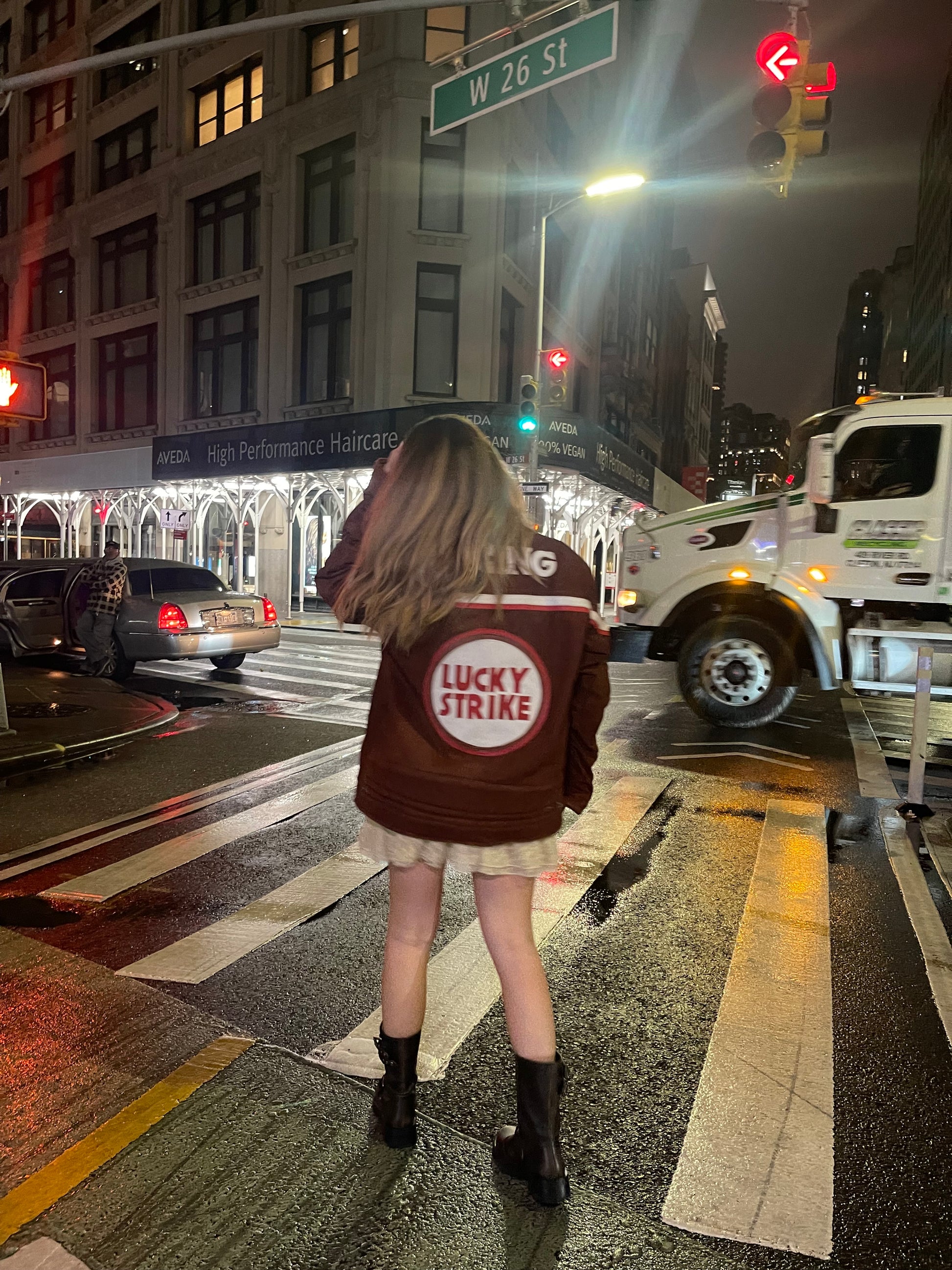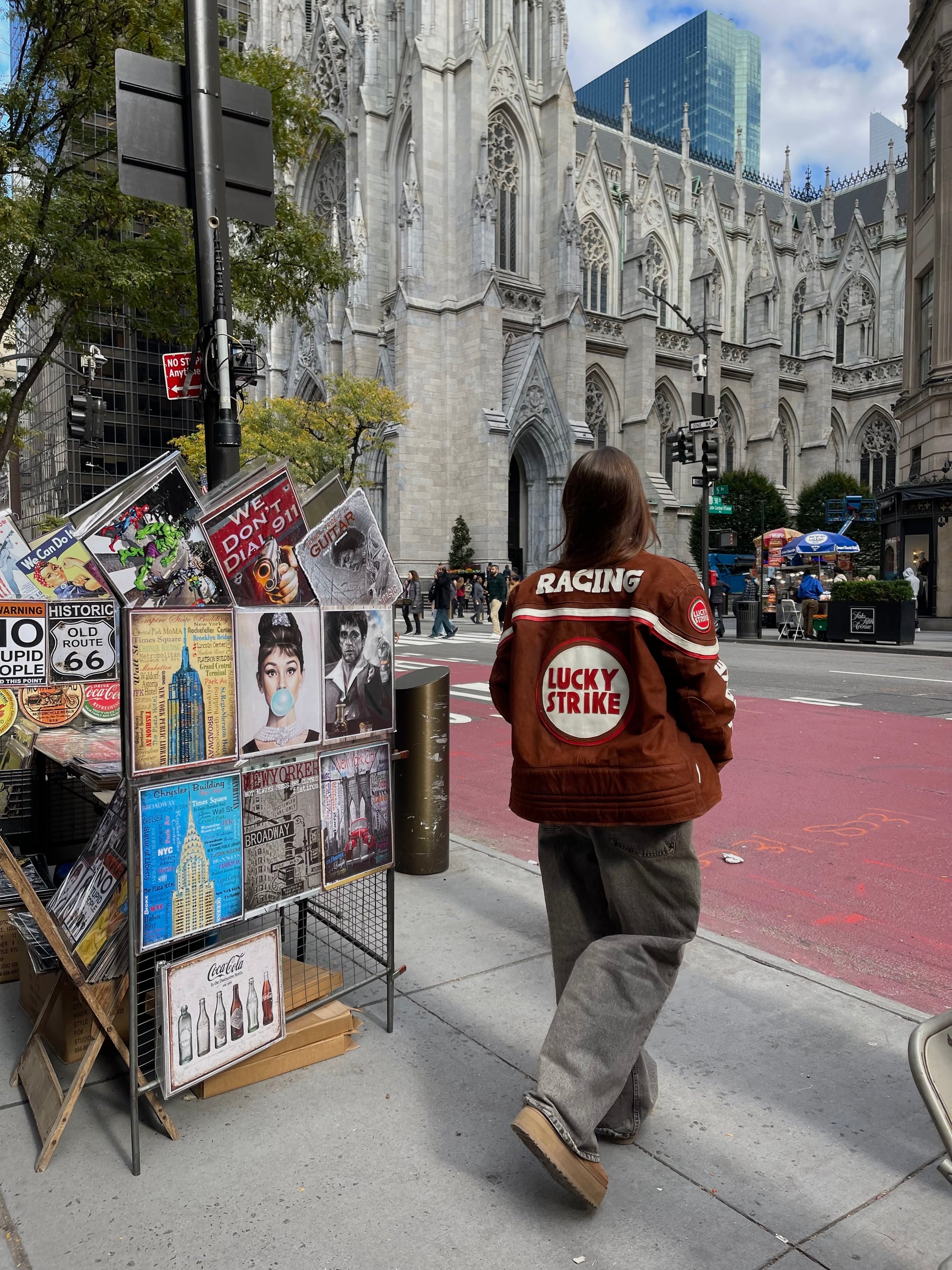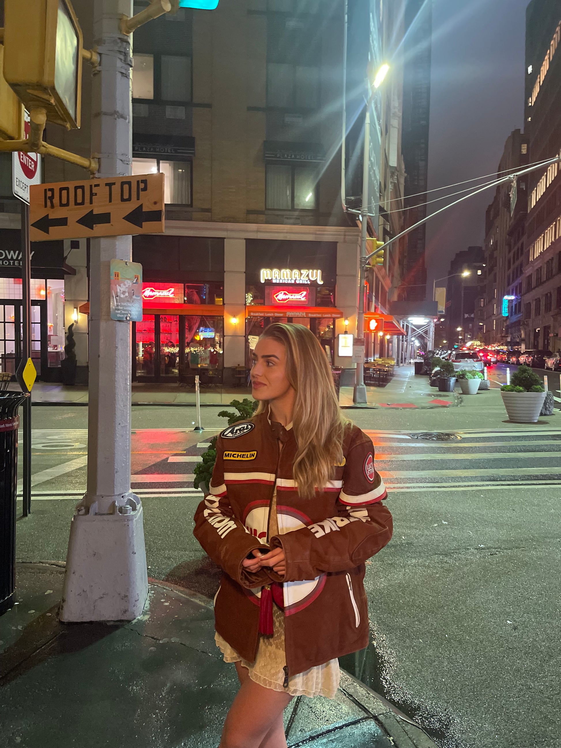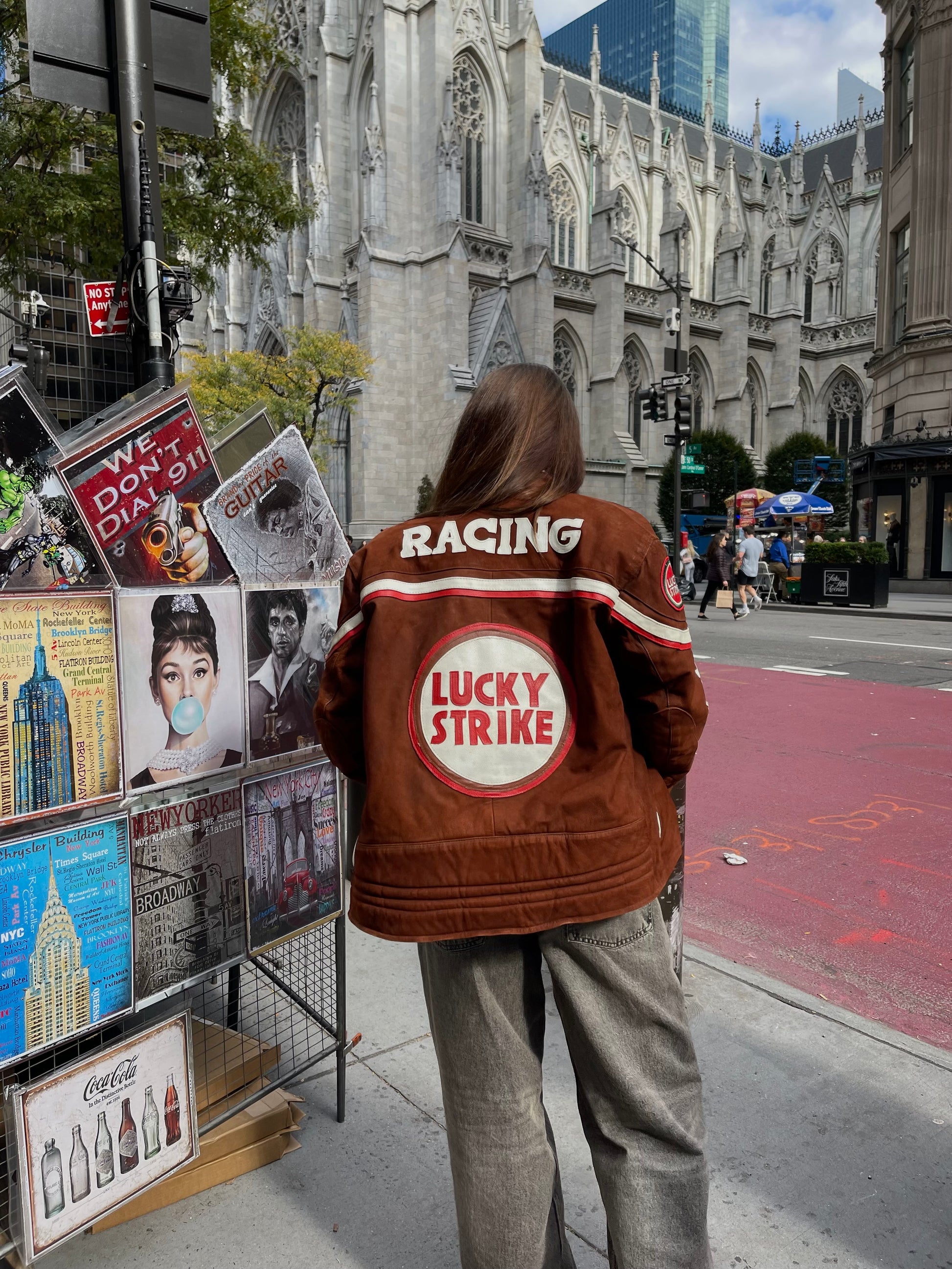 A unique and rare Lucky Stripe vintage brown suede racer / bomber style jacket.